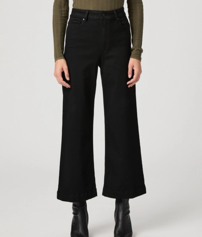 Paiges Anessa is a high-rise wide leg jean that has a slightly relaxed fit and an ankle length silhouette. In their best-selling black shadow wash, this pair is cut from TRANSCEND, the original high-stretch fabric that redefined comfort in denim.
