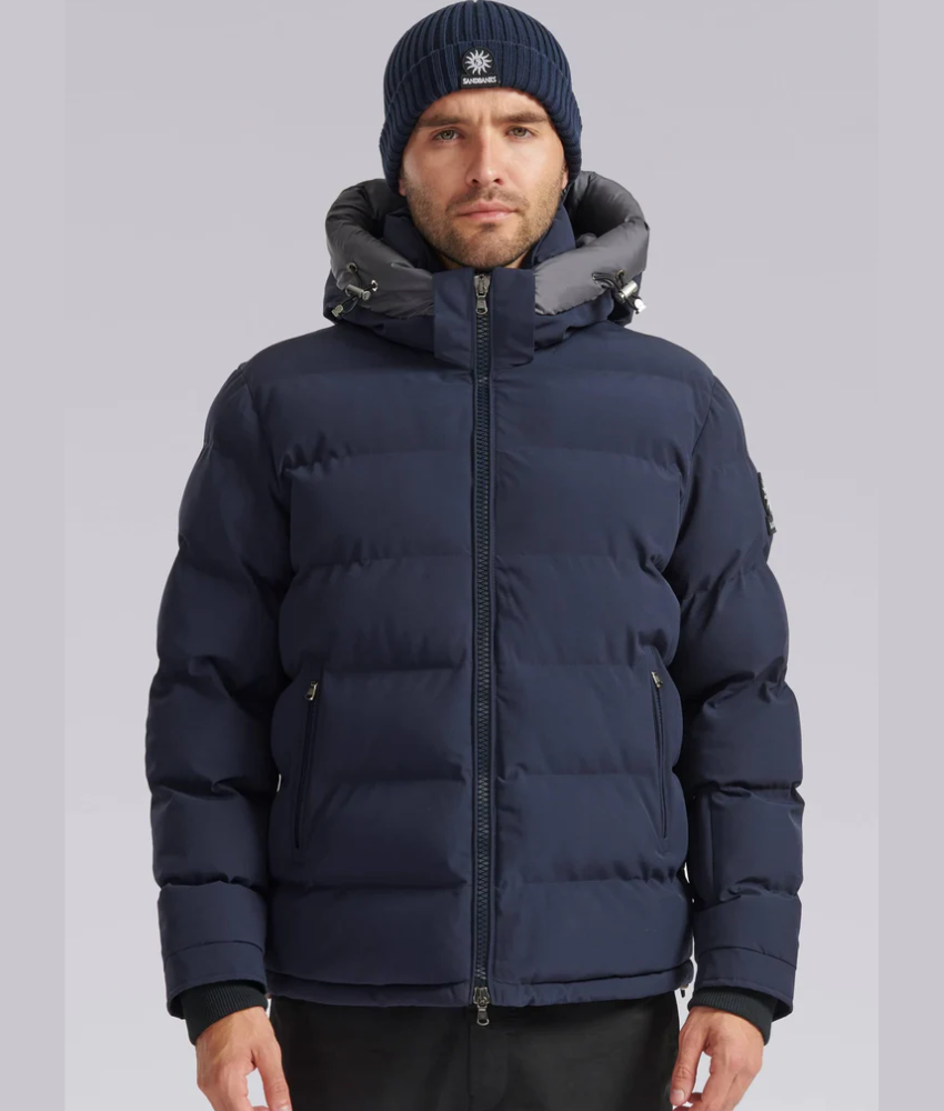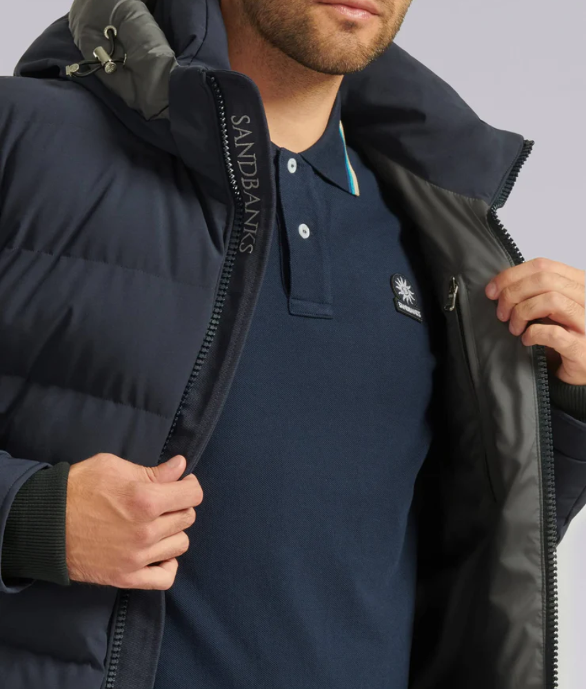 Sandbanks Banks puffer jacket is made almost entirely from recycled plastic bottles. With a navy shell fabric, this has high thermal retention and features a Sandbanks embroidered logo badges, large lower pocket/chest pocket details and detachable hood.