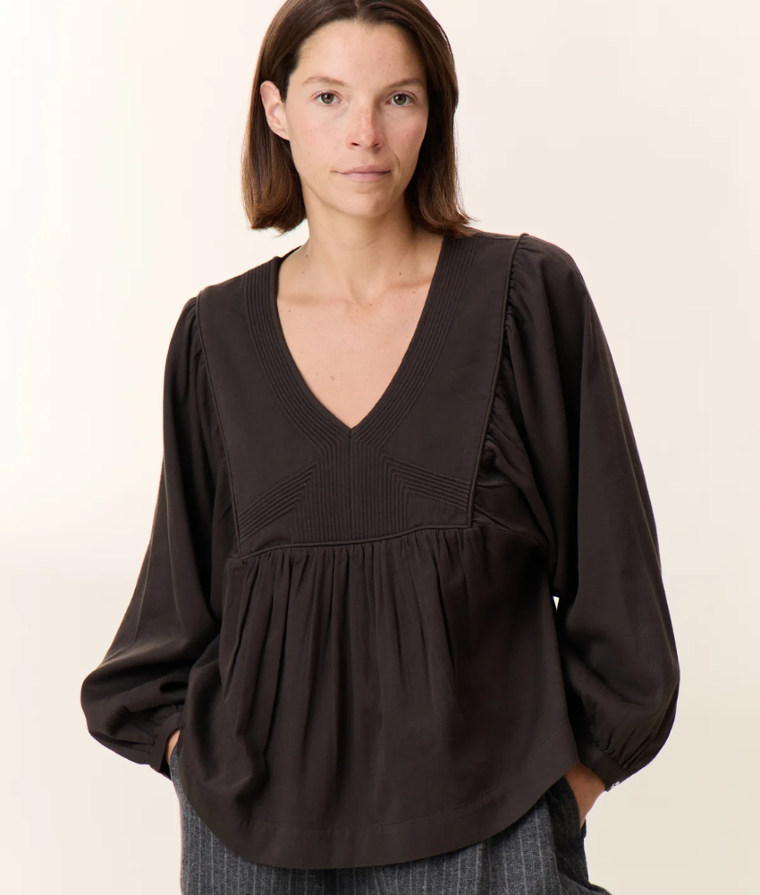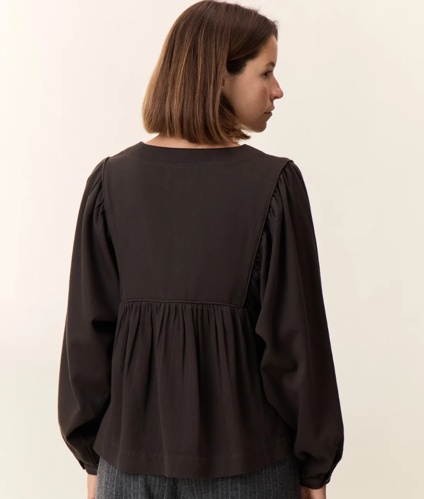 The Corry top from Leon & Harper reveals an assertive silhouette with its V-neckline and the yoke structuring the bust. The front is worked with a succession of vertical folds, giving a graphic relief. Gathers placed under the yoke create soft volume and a natural fall. The long, loose sleeves, tightened at the wrists, create an easy-going look. You combine it with refined pants or jeans as desired.
