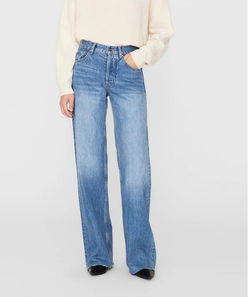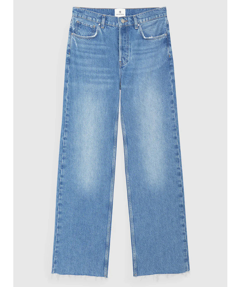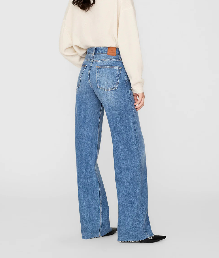 The Anine Bing Hugh Jean is a relaxed, '90s-inspired style constructed from midweight rigid organic cotton denim without stretch in a classic blue wash with vintage-inspired grinding, hand sanding, and highs and lows throughout.