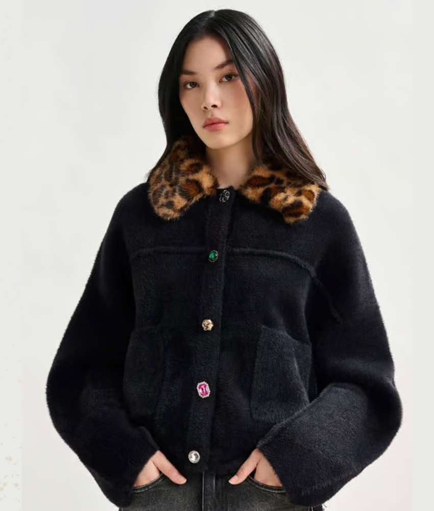 Essentiel Antwerp's Intention jacket is an eye-catching piece, designed in their iconic fuzzy knit. Featuring a mix of playful, mismatched buttons along with two functional patch pockets. A removable leopard-print faux fur collar that lets you switch up your style when you fancy! Perfect for layering or making a statement all on its own.