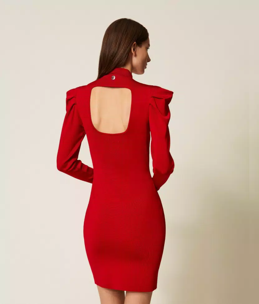 Twinset Actitude collection short viscose blend knit dress with draping on the shoulders. Turtle neck, long sleeves, metal logo plate at the back, fitted. The viscose used to make this garment (81% viscose) was obtained from pre-consumer recycled cotton.