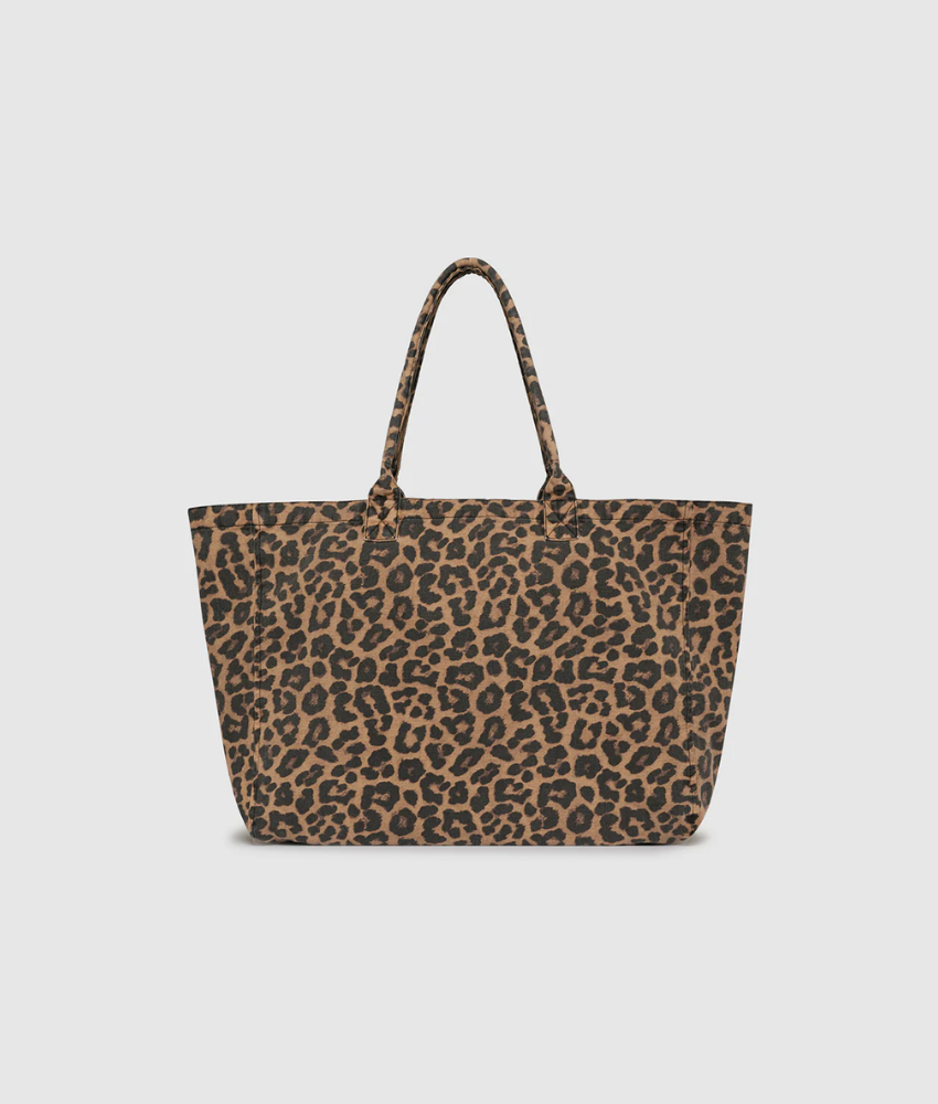 Anine Bings Leo Canvas Tote ia an unlined tote bag featuring an all-over black and brown leopard print and screen-printed ANINE BING branding in contrast white.