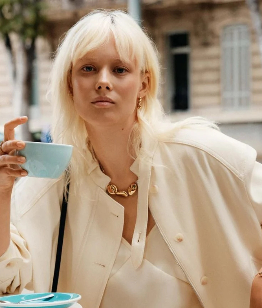The Leora Necklace from Edblad is inspired by beach stones, gently shaped by the endless rhythm of the sea - a harmonious blend of natural contours and refined, minimalist elegance. Seen here in a bold statement necklace in 14K gold plating, with a faceted curb chain and three large, irregularly-shaped stones. Creates a dramatic effect on an open shirt or over a jumper. Pairs superbly with any of the earrings from the same line.