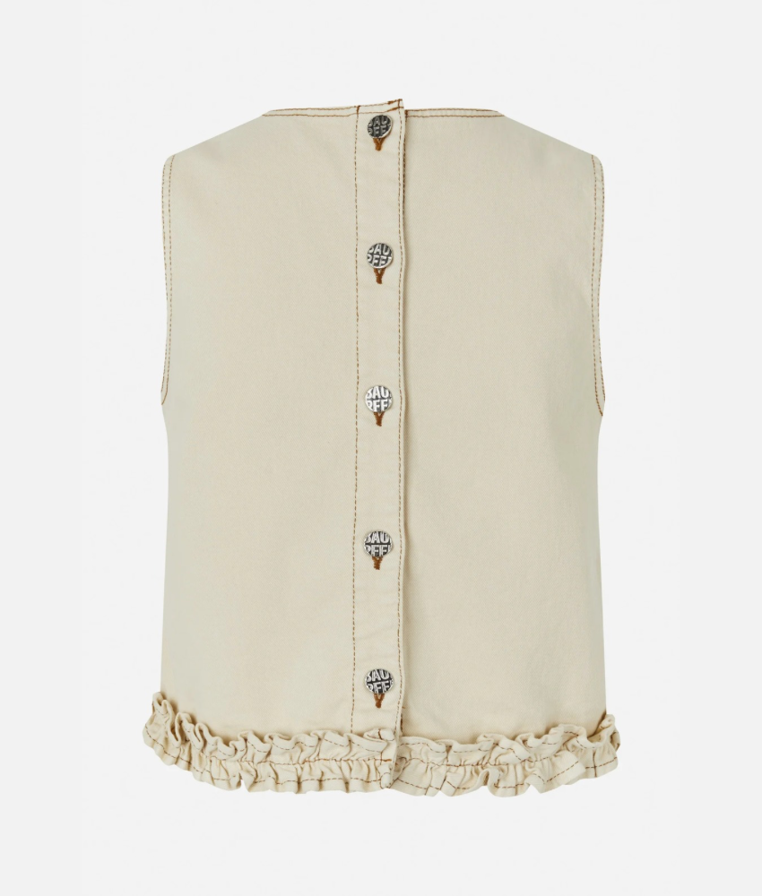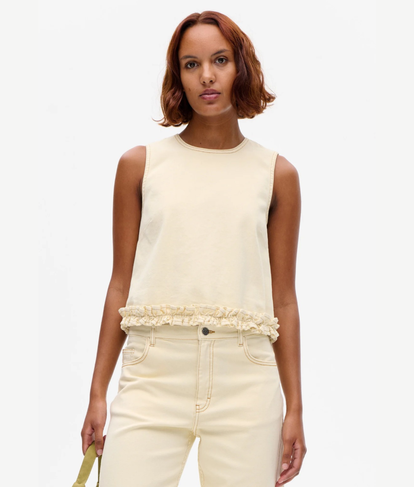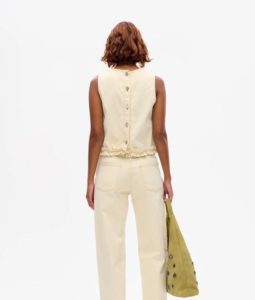 The Madie Top from Baum Und Pferdgarten is a sleeveless denim top, made in organic cotton twill. It has a cropped and relaxed fit and frills at the hemline.