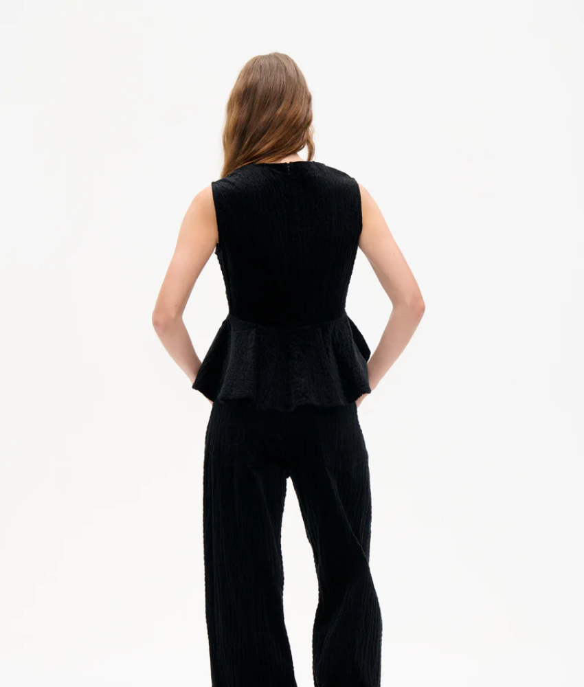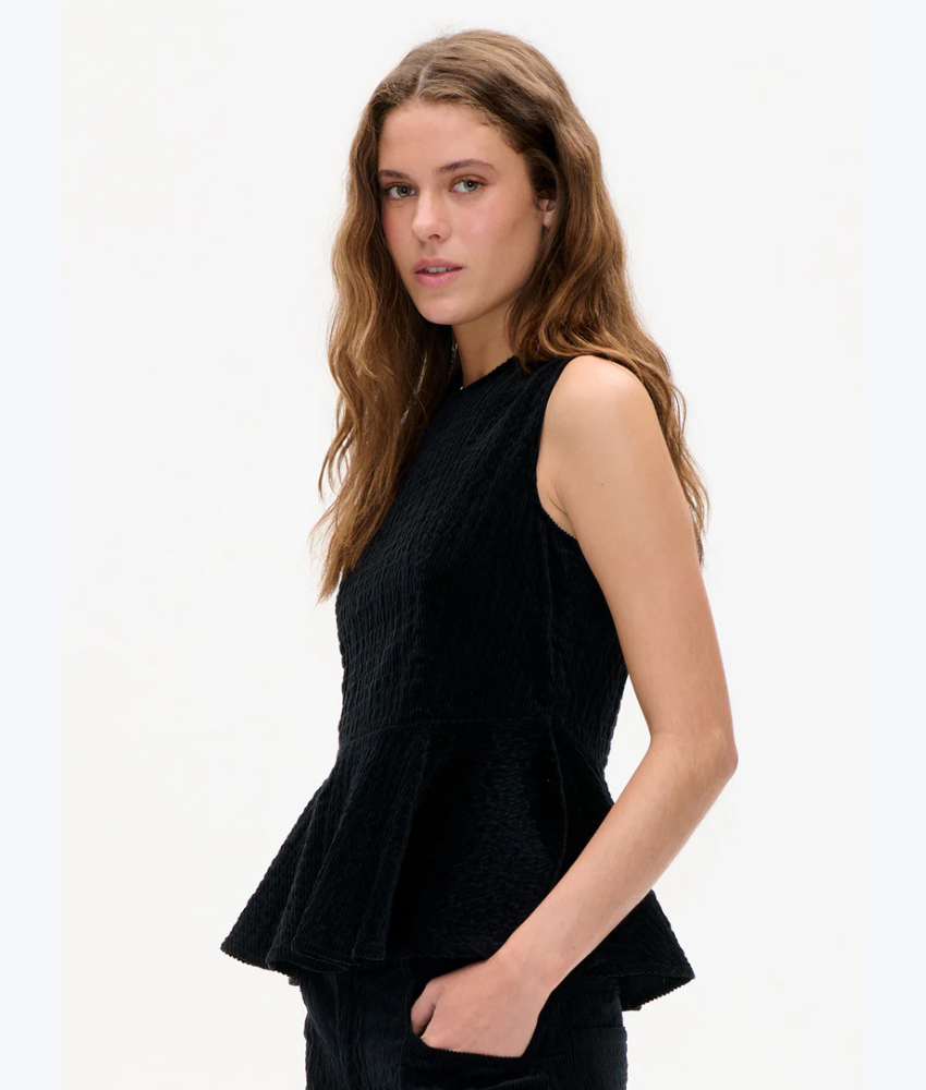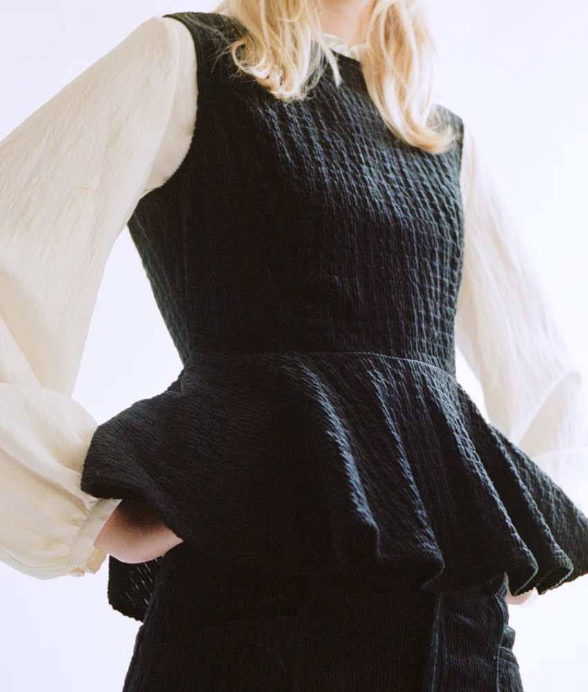 Baum Und Pferdgarten's Melise Top is an everyday style made in soft crinkled corduroy in organic cotton. The peplum top has a relaxed yet tailored silhouette with its slightly fitted top and flared skirt.