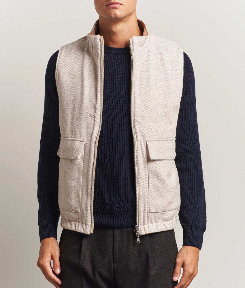 This reversible wool vest from Stenstroms features a stand up collar, pockets and a two way zipper for flexible styling.