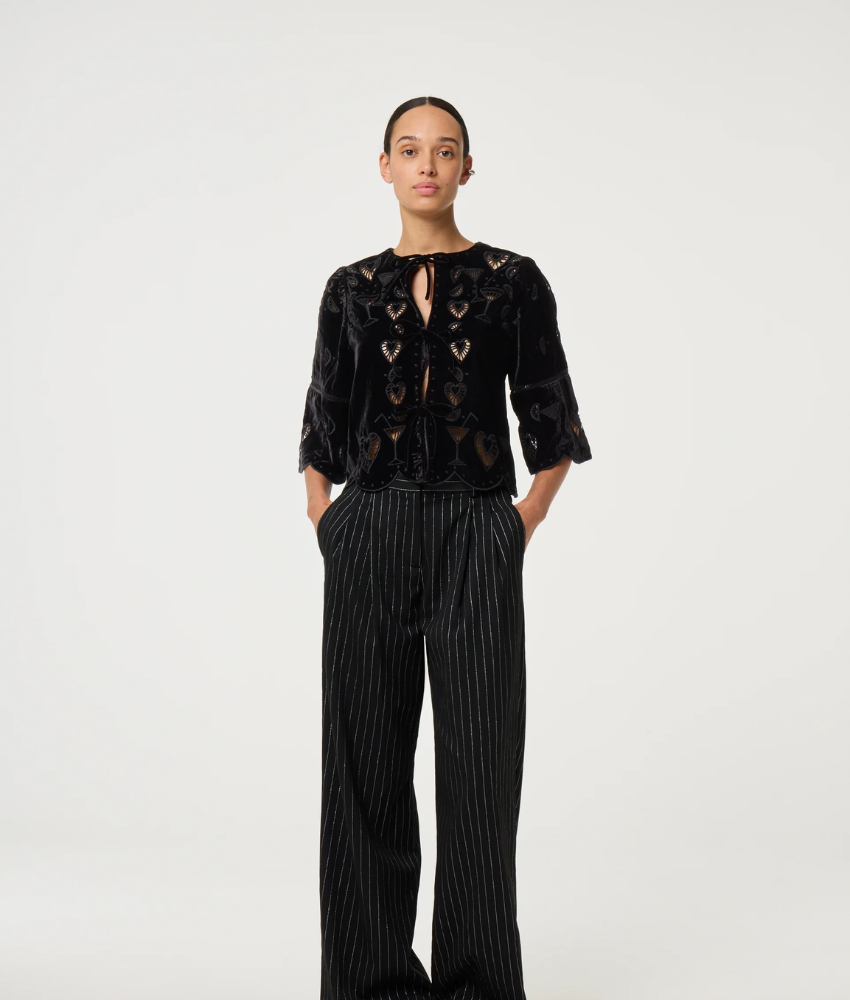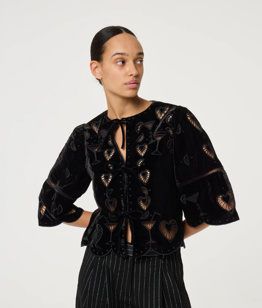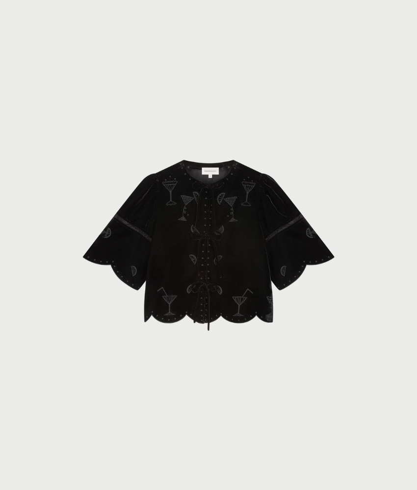 Fabienne Chapot's Roarie is a black blouse featuring a playful embroidered cocktail glass motifs. Designed with wide, flared sleeves and a relaxed fit, it brings a fun yet elegant touch to your outfit. Lightweight and versatile, it pairs easily with skirts, trousers, or jeans for both casual and festive occasions.