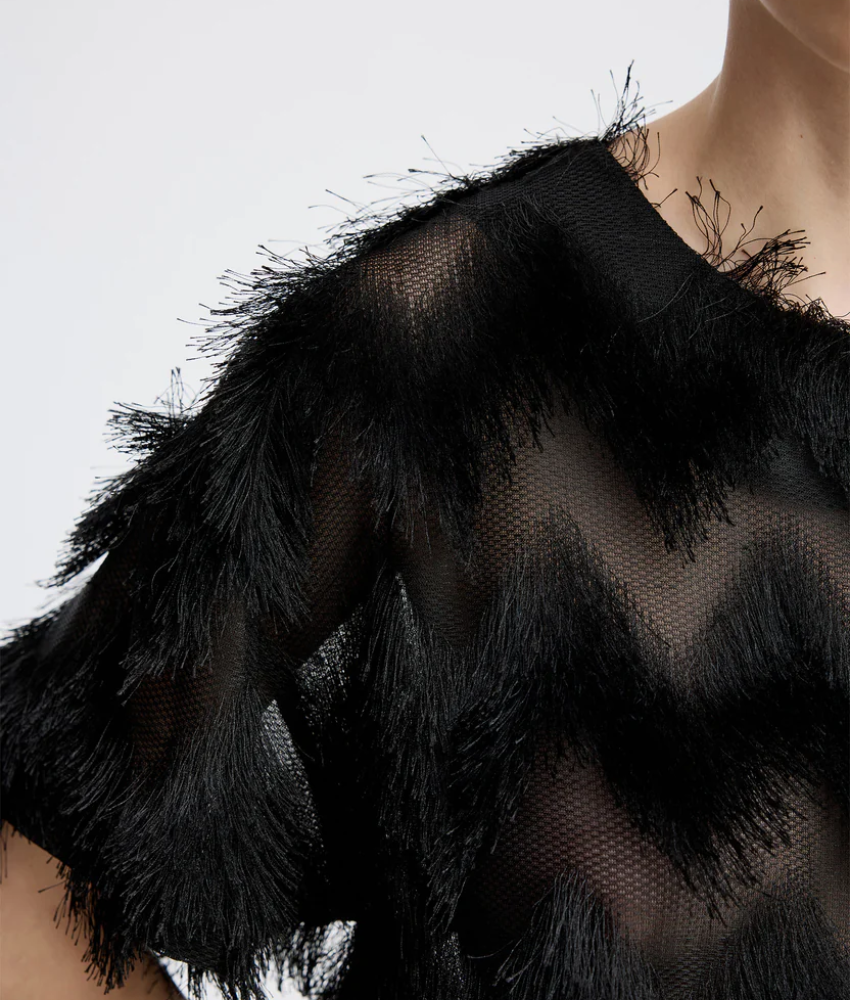 Munthe's Rossi is a statement top designed with short sleeves and a relaxed fit, featuring striking fringed fabric that creates a stylish silhouette with an elegant texture.